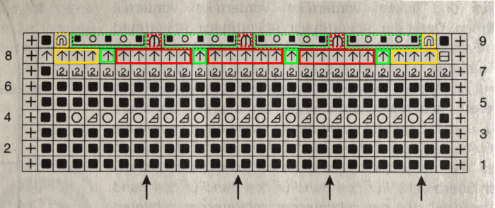 Zur Verdeutlichung habe ich ein paar farbige Markierungen in die Strickschrift eingefügt und das Ganze zusätzlich auch mal mit 3 Rapporten gezeichnet, dann wird es vielleicht klarer.